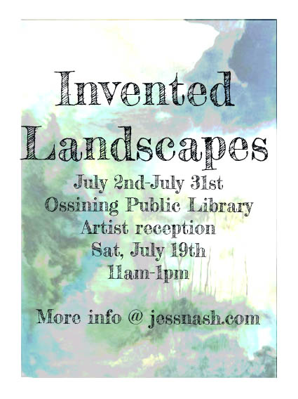 July Ossining Library Show Posted on June 24, 2014June 24, 2014 by jessicanashart I have a small show at the Ossining Public library, 53 Croton Ave, Ossining, NY. Please join me for the reception. Share this: Click to share on X (Opens in new window) X Click to share on Facebook (Opens in new window) Facebook Like Loading... Related Published by jessicanashart View all posts by jessicanashart