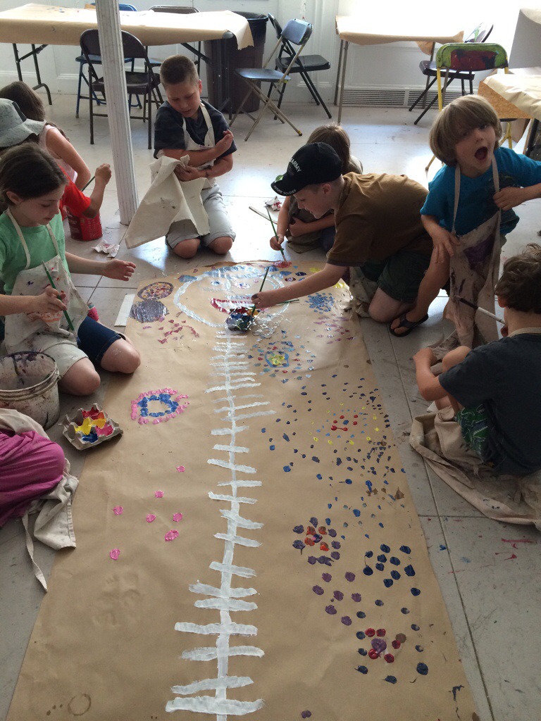 I just finished my first session of the summer program at Garrison Art Center with the 2nd-4th graders and I had a great time! The first photo shows our group working on large murals inspired by Aboriginal Art from Australia, students started by drawing a large animal skeleton on brown kraft paper (we discussed how the Aborigines traditionally paint on bark and that if they accidentally wrinkled the paper while sitting it helped us create a “bark” effect) They then painted dots around the animals in a pattern of colors.