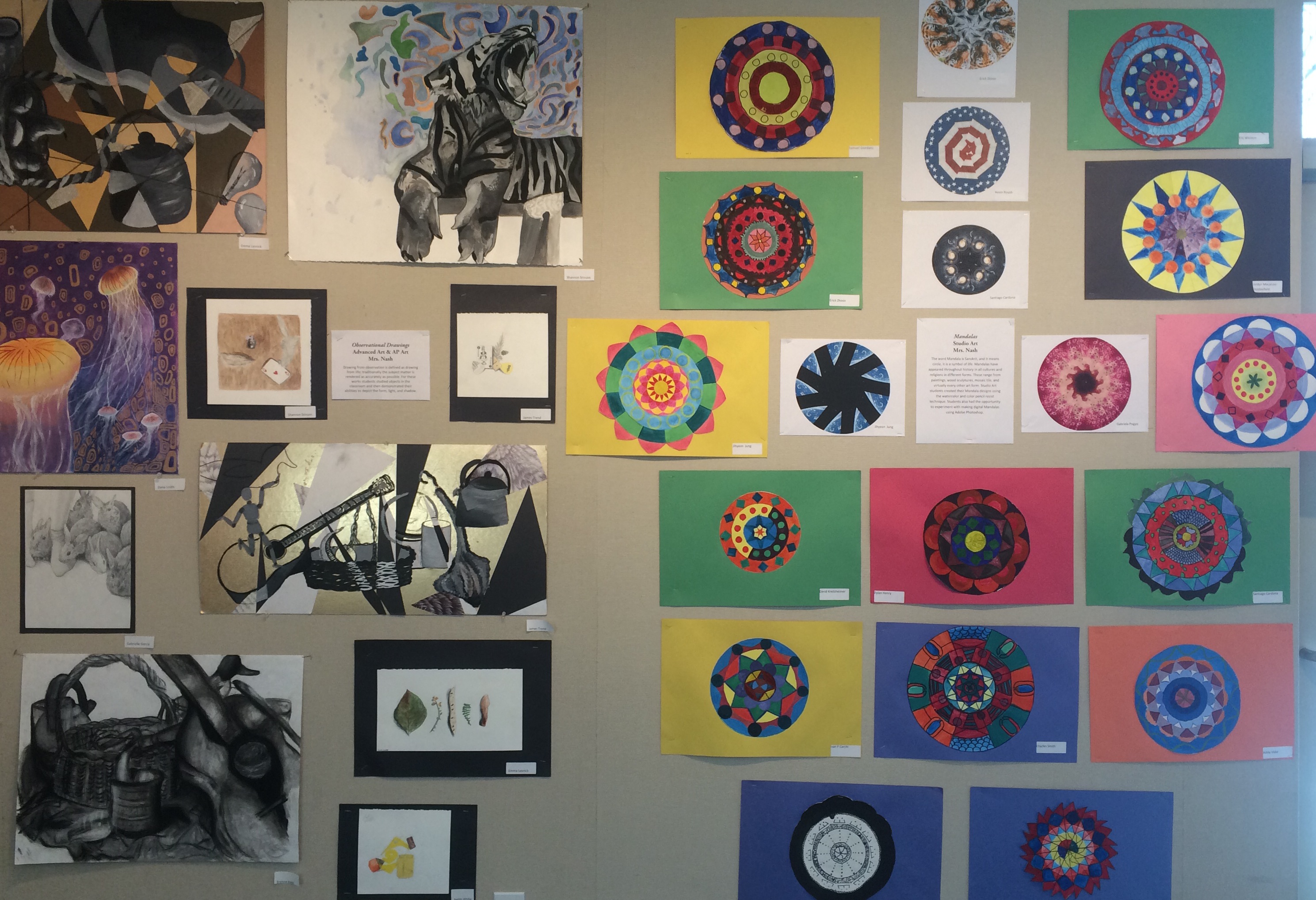 This year my Studio Art students of mixed grades 9-12 made beautiful painted & digital mandalas that I HAD to put in our district show. My Advanced Art & AP Art students worked on various observational drawings and as always they did a fantastic job!