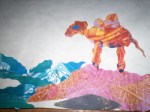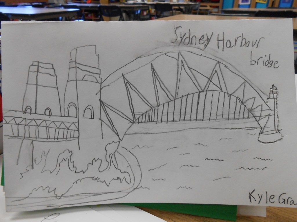 After seeing the folk art exhibit in the museum I worked with students to create aboriginal paintings on “bark” (kraft paper)